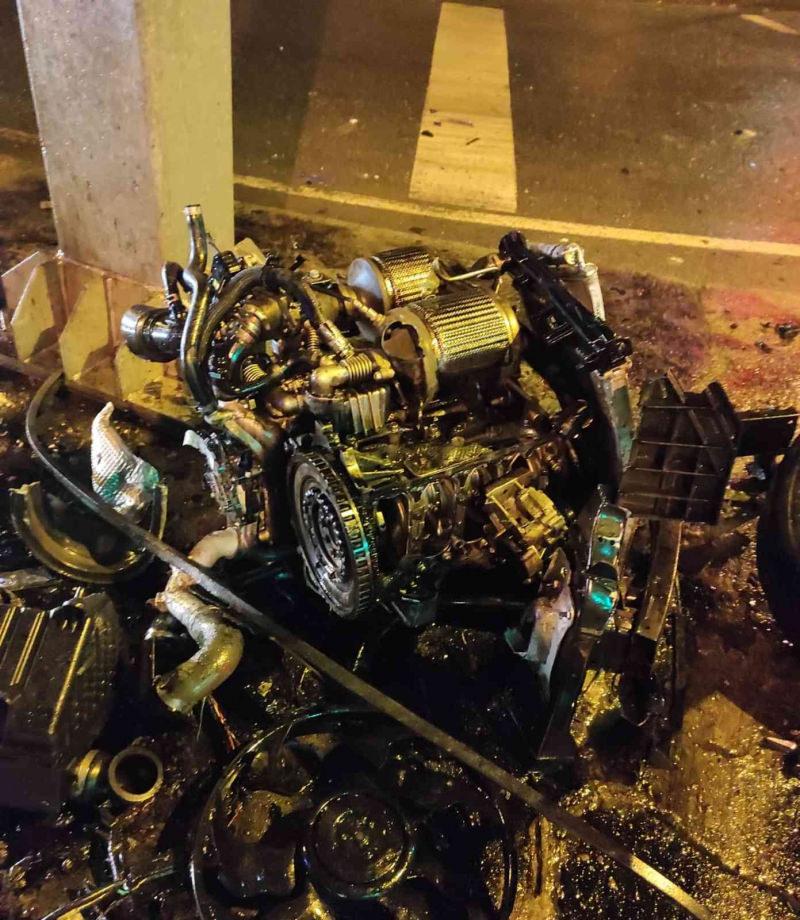 Çarpmanın etkisiyle ise aracın motoru yerinden tamamen koptu. Feci kaza ise kameralara yansıdı.