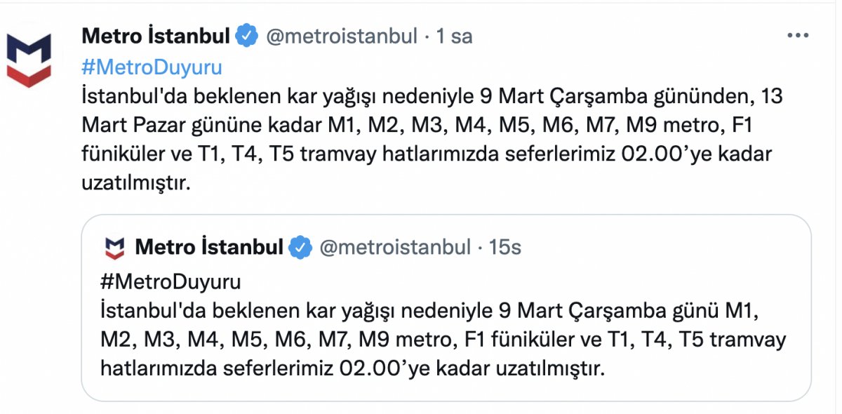 Metro İstanbul'un sosyal medya hesabından yapılan paylaşımda, "İstanbul'da beklenen kar yağışı nedeniyle 9 Mart Çarşamba gününden, 13 Mart Pazar gününe kadar M1, M2, M3, M4, M5, M6, M7, M9 metro, F1 füniküler ve T1, T4, T5 tramvay hatlarımızda seferlerimiz 02.00'ye kadar uzatılmıştır." ifadelerine yer verildi.