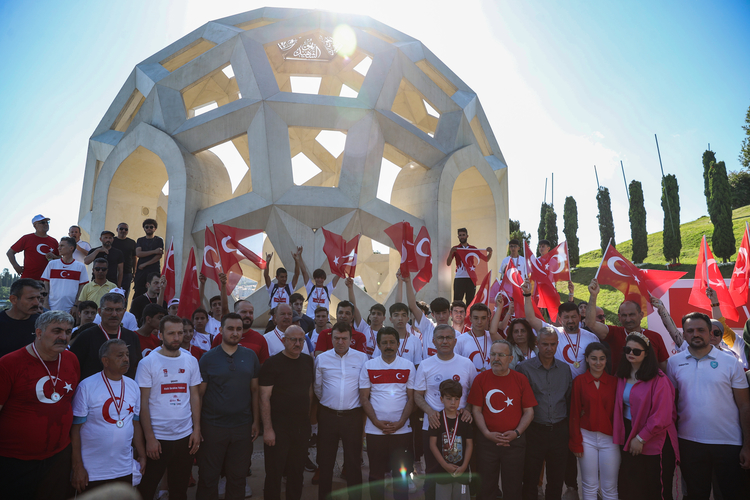 Sporcular burada Türk bayrağını 15 Temmuz şehitlerinden Mahir Ayabak'ın ablası Zehra Ayabak ile şehit Mete Sertbaş'ın kızı Selim Sertbaş'a teslim etti. Şehit yakınları bayrağı teslim aldıktan sonra öperek, alnına koydu.