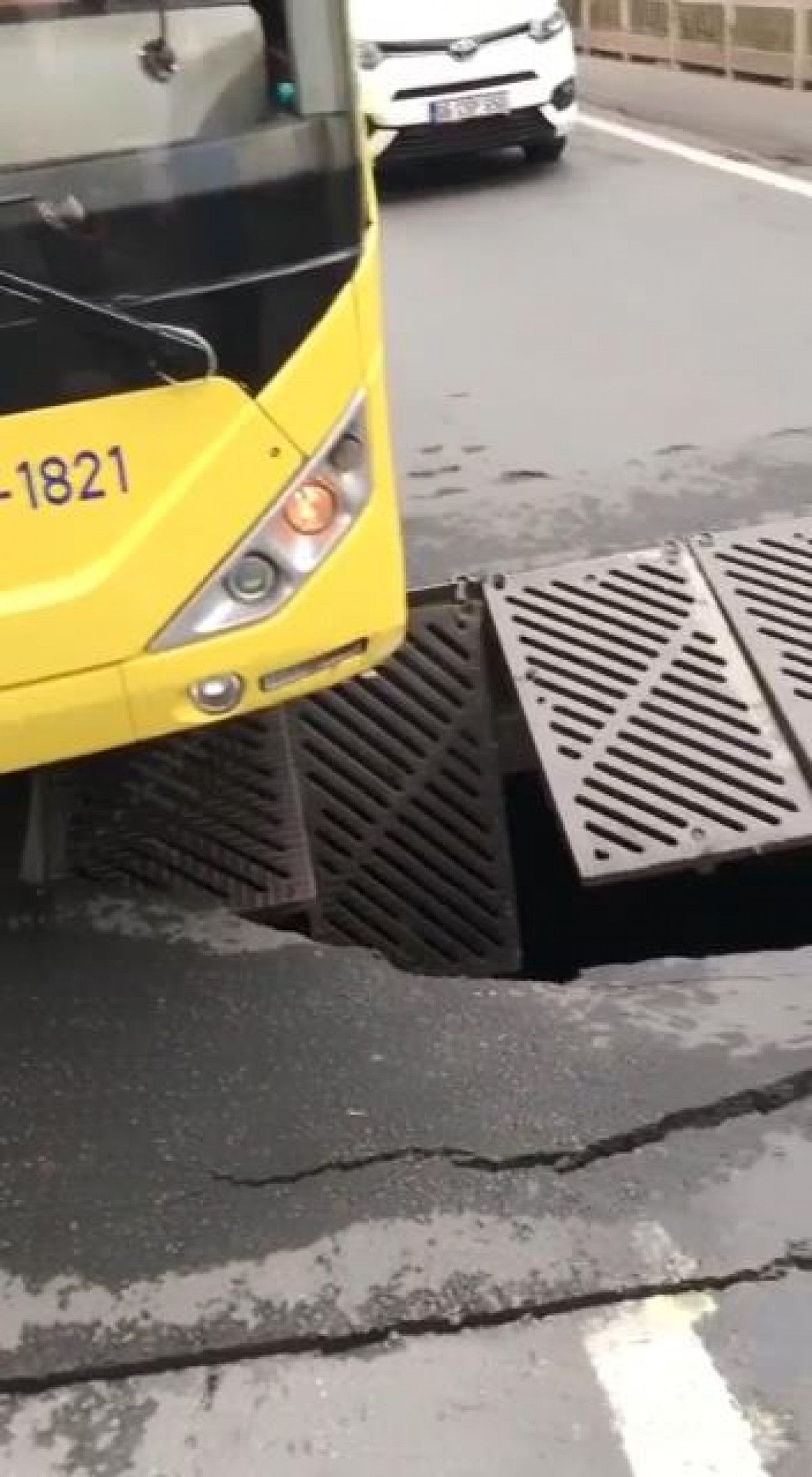 İETT otobüsünün sabah saatlerinde seyir halinde ilerlediği sırada üzerinden geçtiği rögarın çökmesiyle vatandaşlar korku dolu anlar yaşadı.