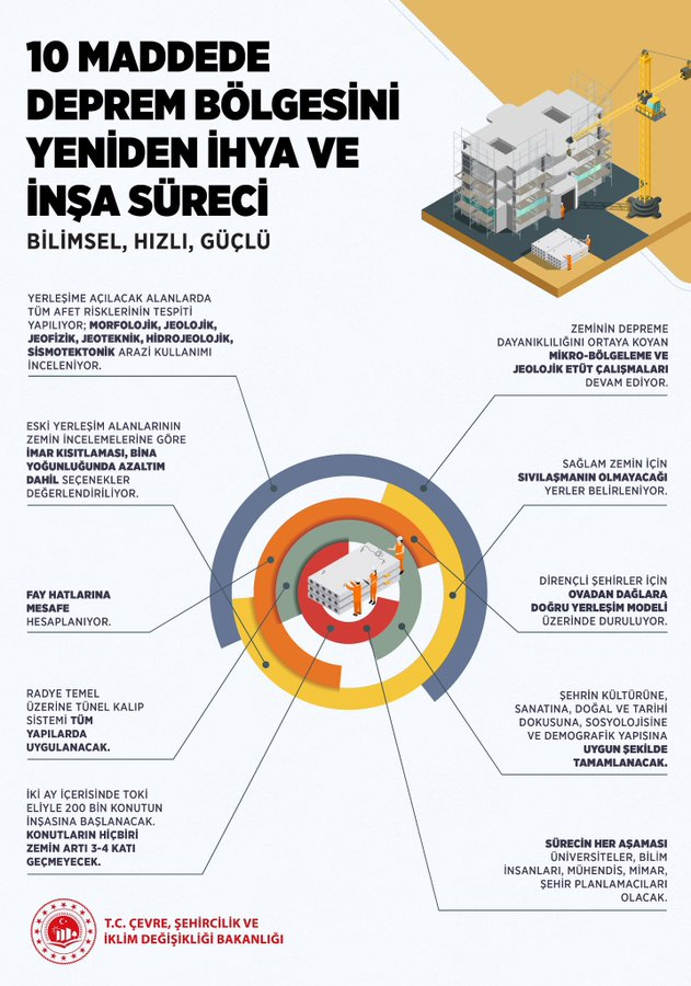 Bakan Kurum'un, "10 Maddede Deprem Bölgesini Yeniden İhya ve İnşa Süreci, Bilimsel, Hızlı ve Güçlü" ifadesiyle paylaştığı bilgiye göre, yapılacak çalışmalar şöyle sıralandı: