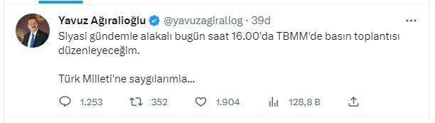 İYİ Parti Lideri Meral Akşener'e sert sözlerin söylendiğinin ortaya çıkması, Akşener'in kumar masası olarak adlandırdığı ittifaka geri dönmesi, ittifak paydaşlarının HDP ile açıktan bakanlık pazarlığına girişmesi sonrası rahatsız olduğu belirtilen ve dünkü Kemal Kılıçdaroğlu'nun adaylığı için grup kararı alınan toplantıya katılmayan Yavuz Ağıralioğlu, bugün saat 16.00'da basın toplantısı düzenleyeceğini duyurdu.