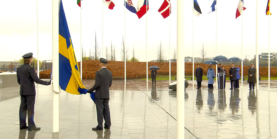 NATO karargahında yapılan törene NATO Genel Sekreteri Jens Stoltenberg, İsveç Prensesi Victoria, İsveç Başbakanı Ulf Kristersson ile kabine üyeleri, NATO'ya üyelik başvurusunda bulunan eski Başbakan Magdalena Andersson ve siyasi parti liderleri katıldı.