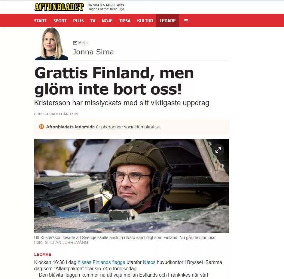 Finlandiya dün resmi olarak NATO’ya katılırken İsveç basınında öfke hakimdi. İsveç merkezli Aftonbladet gazetesi 'Tebrikler Finlandiya, ama bizi unutmayın' başlığı ile verdiği haberde "Başbakan en önemli görevinde başarısız oldu" ifadelerine yer verdi.