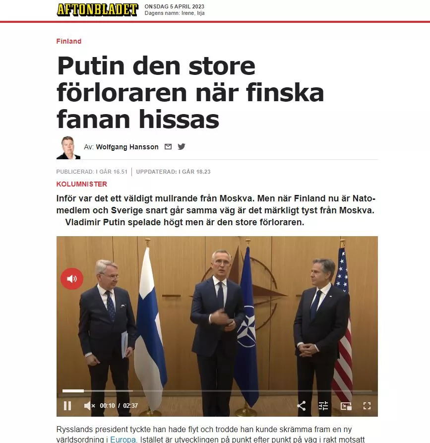 “Bir yıldan biraz daha uzun bir süre sonra, Finlandiya bayrağı bugün saat 15:35'te Brüksel'deki NATO karargahında dalgalandı. Finlandiya, tarihi bir genişlemeyle NATO'nun 31. üye devleti oldu. İsveç'in oldukça yakın bir gelecekte 32. ülke olarak seçilme olasılığı yüksektir. Güvenlik politikası açısından bu, Putin'in geçen yıl 24 Şubat'ta Ukrayna'yı işgal emri vermesinden bu yana Rusya yöneticileri için ilk kalıcı yenilgi.”