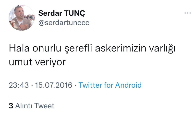 İYİ Parti Siyasi İşler Başkanı Koray Aydın'ın Ankara il başkanı olacağını öne sürdüğü Serdar Tunç'un 15 Temmuz hain darbe gecesi attığı tweetler ortaya çıktı. Serdar Tunç darbeci FETÖ'cü askerleri 'şerefli' olarak adlandırmış.
