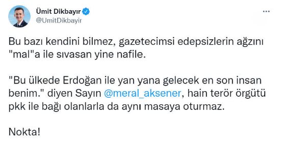 İYİ Parti Mali İşler Başkanı ve Sakarya Milletvekili Ümit Dikbayır, Twitter hesabından yaptığı paylaşımda ağır ifadeler kullandı.