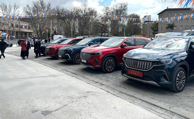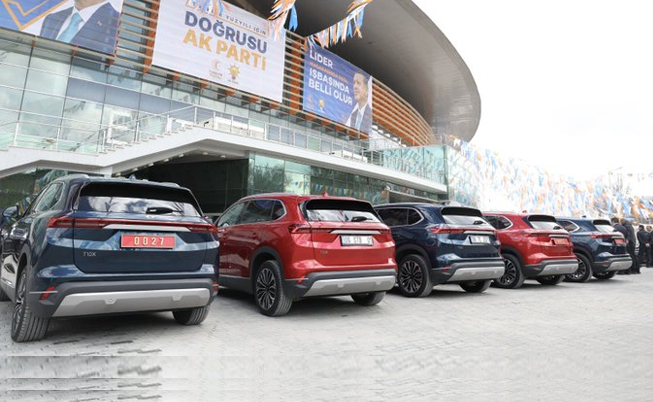Toplantının yapıldığı salonun önünde, "Anadolu kırmızısı" ve "Gemlik mavisi" renklerindeki Togg otomobillerin yan yana park edildiği görüldü.
