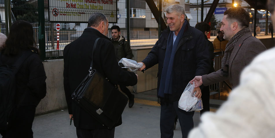 Küçükyalı Marmaray İstasyonu’nda sabah işlerini gitmek üzere yola çıkan vatandaşlara simit ikram eden Kadem Ekşi, 31 Mart yerel seçimlerinde destek istedi.