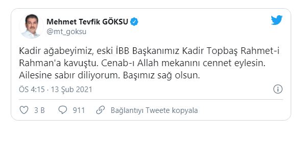 Haberi kişisel sosyalmedya Twitter hesabından duyuran Esenler Belediye Başkanı Tevfik Göksu, "Kadir ağabeyimiz, eski İBB Başkanımız Kadir Topbaş Rahmet-i Rahman'a kavuştu. Cenab-ı Allah mekanını cennet eylesin. Ailesine sabır diliyorum. Başımız sağ olsun" dedi. Topbaş, bir süredir yeni tip koronavirüs (Kovid-19) tedavisi görüyordu.