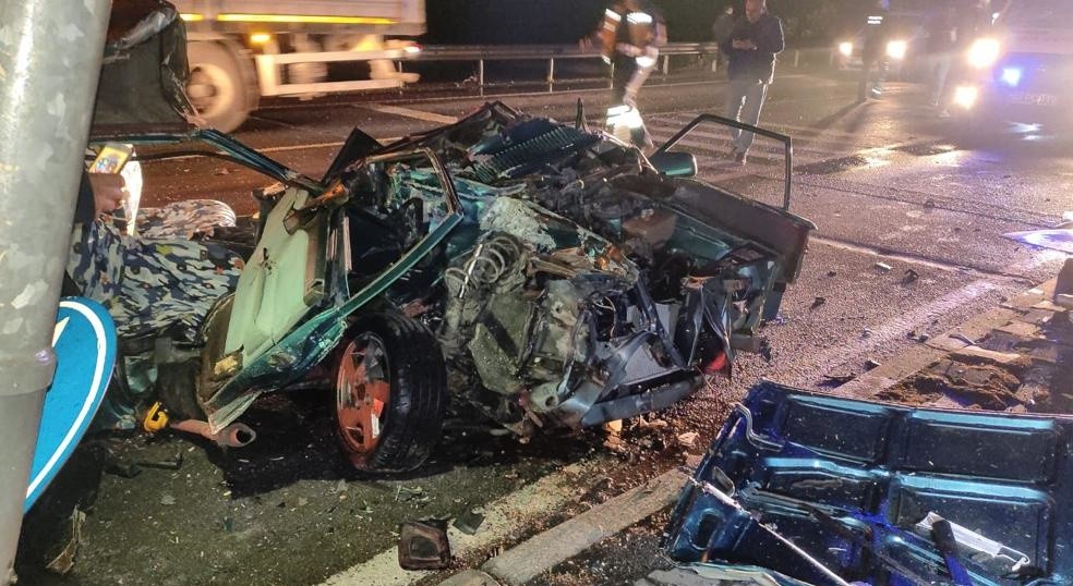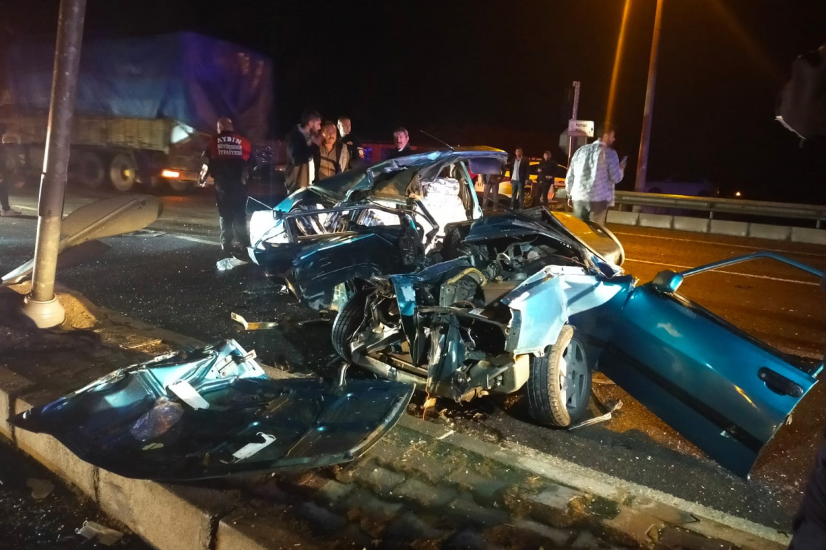 Çarpışmanın etkisi ile hurda yığınına dönen otomobilin sürücüsü ve ismi öğrenilemeyen yolcu konumundaki bir kişi araçta sıkışarak ağır yaralanırken, devrilen kamyondaki ürünler de yola savruldu.