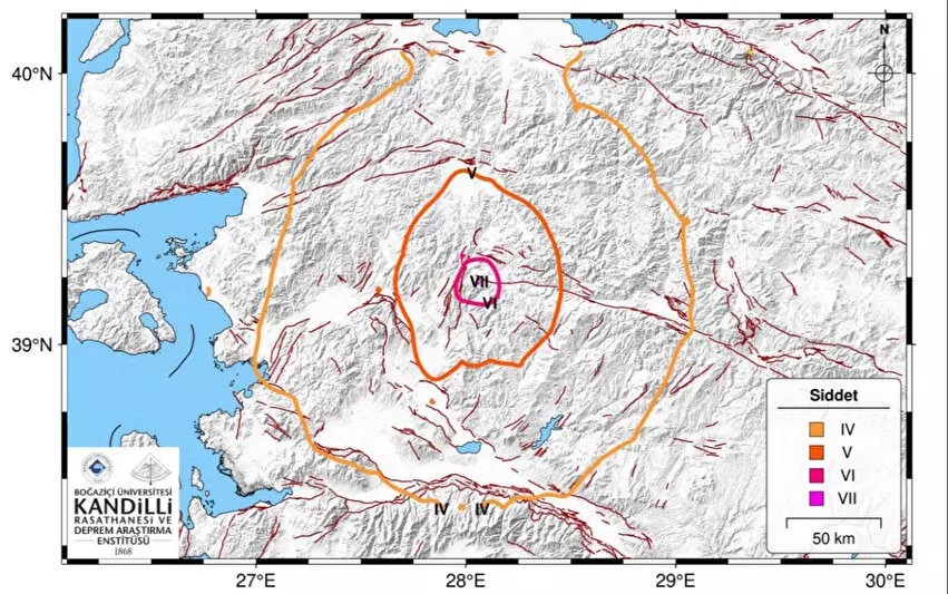 Depremin yüzeyde yarattığı etkiyi ölçen şiddet haritası, Earthquake Loss Estimation Routine (ELER) programı kullanılarak hazırlandı. Kandilli’nin tahmini şiddet analizine göre, merkez üssünde hissedilen şiddet Iₒ=VII olarak belirlendi. Bu seviye, ciddi sarsıntı ve yapısal hasar riski anlamına geliyor.