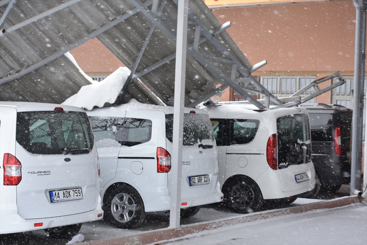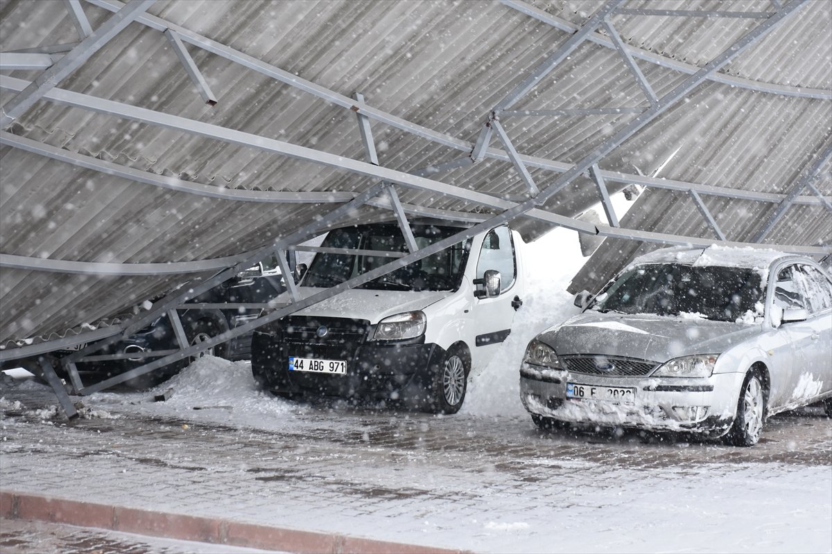 Malatya'nın Yeşiltepe bölgesindeki Galericiler Sitesi'nde iş yerlerinin önündeki demir çatı, karın ağırlığına dayanamayarak çöktü.