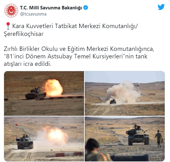 MSB, "Kara Kuvvetleri Tatbikat Merkezi Komutanlığı Şereflikoçhisar'da Zırhlı Birlikler Okulu ve Eğitim Merkezi Komutanlığınca, “81’inci Dönem Astsubay Temel Kursiyerleri”nin tank atışları icra edildi." paylaşımında bulundu.