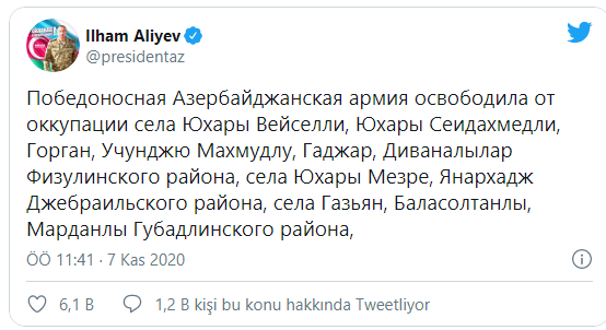 Azerbaycan Cumhurbaşkanı İlham Aliyev tarafından Twitter üzerinden yapılan açıklamaya göre, Dağlık Karabağ bölgesinde ilerleyişini sürdüren Azerbaycan ordusu tam 16 yerleşim yerinin daha Ermenistan'ın varlığından arındırıldığı öğrenildi. Dağlık Karabağ'da 16 yerleşim yeri işgalden kurtarıldı.