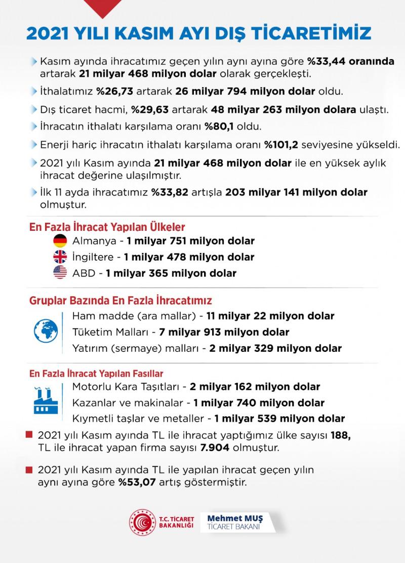 Kasım ayı ihracatında rekor kırıldı. Ticaret Bakanı Mehmet Muş, "İhracatımız kasımda, geçtiğimiz yılın kasım ayına göre yüzde 33,4'lük artışla 21,5 milyar dolar seviyesinde gerçekleşti. Bu değer, en yüksek aylık ihracatımız" dedi.