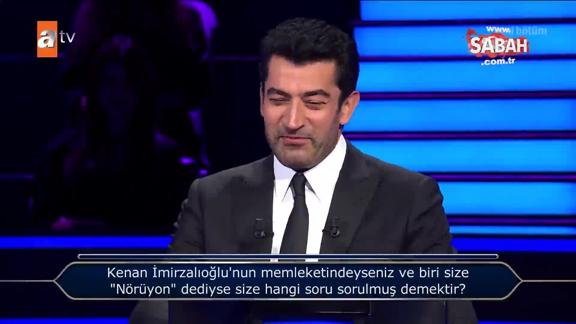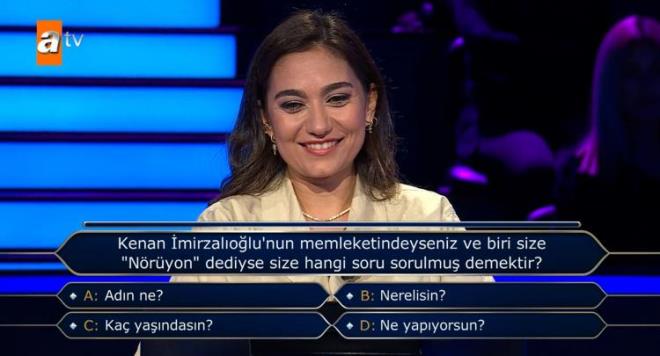 Yarışmaya katılan yarışmacının karşısına, 'Kenan İmirzalıoğlu'nun memleketindeyseniz ve biri size 'Nörüyon?' dediyse size hangi soru sorulmuş demektir?' sorusu çıktı.