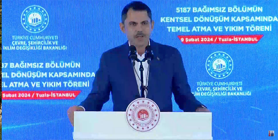Murat Kurum, bugün İstanbul'un birçok farklı ilçesinde kentsel dönüşüm projelerinin ilk harcının atılacağını belirterek, "İnsanımızın hayatını huzura, refaha ve güvene kavuşturacak olan kentsel dönüşüm çalışmalarımızdan bir yenisini daha başlatmak için Sultan Fatih’in şehrindeyiz; İstanbul’umuzdayız. Bugün hep birlikte 5187 kentsel dönüşüm konutunun bir kısmının temellerini atacak; bir kısmının ise yıkım törenlerini yapacağız. Bir taraftan; Tuzla’mızdan Bağcılar’a; Gaziosmanpaşa’mızdan; Esenler’e; Güngören’den Bahçelievler ve Kartal’a kadar birçok farklı noktada yeni yuvalarımızın ilk harcını dökeceğiz. Diğer taraftan; Bağcılar, Sarıyer, Avcılar, Zeytinburnu, Sultangazi ve Silivri’deki depreme dayanıksız binaların yıkım törenlerini gerçekleştireceğiz. Yüreğimiz; her yeni projeye başladığımızda olduğu gibi, yine coşkuyla ve yine heyecanla dolu. Aynı coşku ve heyecanı sizlerin de yüzlerinde görmekten dolayı, hakikaten mutluluk doluyuz, huzur doluyuz." dedi.
