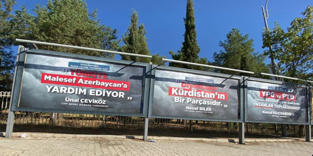 CHP Genel Başkan Yardımcısı Ünal Çeviköz’ün “Türkiye, maalesef Azerbaycan’a yardım ediyor” ve CHP Genel Merkez Parti Meclisi Üyesi Nevaf Bilek’in “Diyarbakır, Kürdistan’ın bir parçasıdır” sözleri de afişlere yansıtıldı.