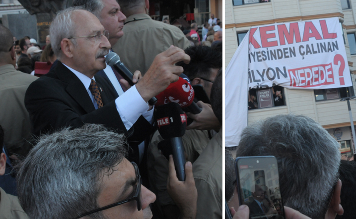 Kurtuluş Parkı önünde banka çıkan Kılıçdaroğlu, burada konuşma gerçekleştirdi. Kılıçdaroğlu'nun konuşması sırasında sol çaprazındaki binaya asılan pankart ortalığı karıştırdı.
