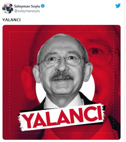 İçişleri Bakanı Süleyman Soylu da Kılıçdaroğlu'nun iddialarının ardından sosyal medya hesabından paylaşımda bulundu. Kılıçdaroğlu'nun fotoğrafını paylaşan Soylu, tepkisini tek kelimeyle gösterdi. Bakan Soylu, paylaşımına 'Yalancı' notunu düştü.