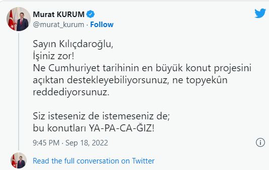 "Sayın Kılıçdaroğlu, (CHP Genel Başkanı Kemal Kılıçdaroğlu) işiniz zor. Ne Cumhuriyet tarihinin en büyük konut projesini açıktan destekleyebiliyorsunuz ne topyekun reddediyorsunuz. Siz isteseniz de istemeseniz de bu konutları yapacağız. İlk temelleri Allah'ın izniyle ekim ayı itibarıyla atıyoruz. Cumhurbaşkanımız Sayın Recep Tayyip Erdoğan bu konutların anahtarlarını vatandaşlarımıza armağan edecek. Milletimize şimdiden hayırlı, uğurlu olsun."