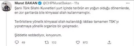 Murat Bakan sosyal medya hesabından yaptığı paylaşımda “Teröristlere yönelik kimyasal silah kullanıldığı iddiası tamamen TSK’yı yıpratmaya yönelik organize bir çalışmadır. Şiddetle reddediyor, kınıyorum” ifadelerini kullandı.