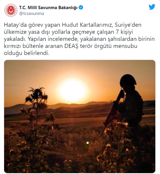 Milli Savunma Bakanlığı (MSB): Hatay'da görev yapan Hudut Kartallarımız, Suriye'den ülkemize yasa dışı yollarla geçmeye çalışan 7 kişiyi yakaladı. Yapılan incelemede, yakalanan şahıslardan birinin kırmızı bültenle aranan DEAŞ terör örgütü mensubu olduğu belirlendi.