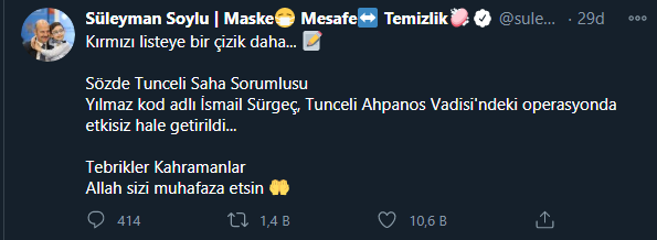 İçişleri Bakanı Süleyman Soylu, Twitter hesabı üzerinden yaptığı açıklamada teröristin TSK tarafından öldürüldüğünü duyurdu. İçişleri Bakanlığı tarafından oluşturulan terörden aranananlar listesinde kırmızı kategoride adı geçen İsmail Sürgeç adlı terörist, Tunceli'nin Ahpanos Vadisi'nde TSK operasyonuyla etkisiz hale getirildi.