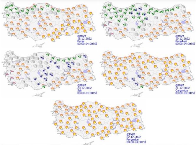 Yapılan en son değerlendirmelere göre; Marmara (Balıkesir’in güney kesimleri ve Bilecik hariç), Batı Karadeniz, Samsun ve Ordu çevrelerinin çok bulutlu batı kesimlerden başlamak üzere aralıklı sağanak yağışlı; diğer yerlerin parçalı ve az bulutlu geçeceği tahmin ediliyor.