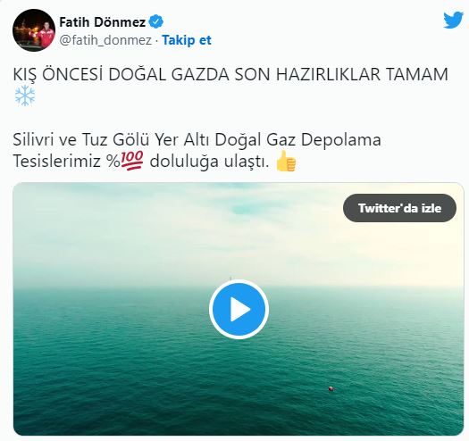 “Kış öncesi doğal gazda son hazırlıklar tamam. Silivri ve Tuz Gölü Yer Altı Doğal Gaz Depolama Tesislerimiz yüzde yüz doluluğa ulaştı” ifadelerine yer verdi.