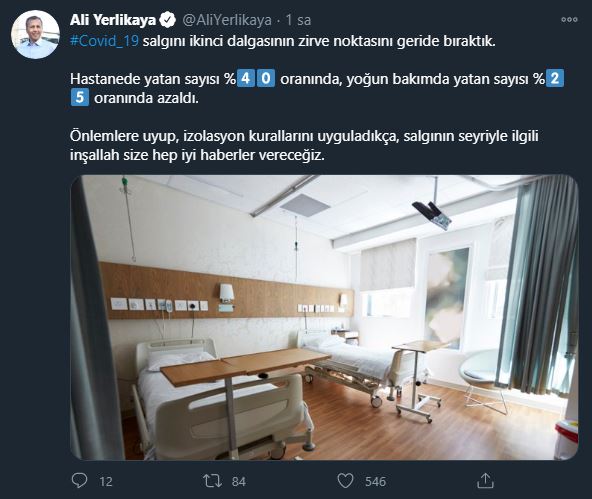 İstanbul Valisi Ali Yerlikaya, Twitter hesabından yaptığı paylaşımda, hastanede yatan kişi sayısının yüzde 40 oranında azaldığını duyurdu. Öte yandan, hastanelerin yoğun bakım servislerinde yatan kişi sayısı da yüzde 25 oranında düştü.