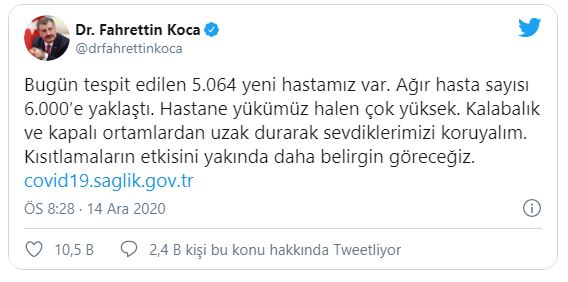 Günlük vakalarını Twitter hesabından değerlendiren Sağlık Bakanı Fahrettin Koca, ağır hasta sayısının 6 bine yaklaştığını, hastanelerdeki yükün bu sebeple halen çok fazla olduğunu aktardı. Vatandaşları kalabalık ve kapalı yerlerden uzak durarak sevdiklerini korumaya davet eden Bakan Koca, uygulanan kısıtlamaların yakın zamanda daha belirgin bir şekilde kendini göstermeye başlayacağını ifade etti.