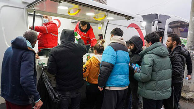 Kiev'den dün kalkan ve yaklaşık bin kişiyi taşıyan trenin Çernivtsi'ye varmasıyla birlikte Türk vatandaşlarına Romanya'ya doğru yola çıkmadan önce Kızılay tarafından gıda desteği sağlandı.