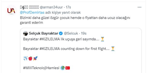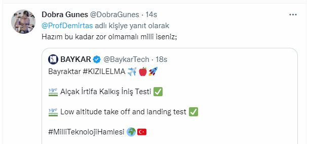 Baykar Genel Müdürü Haluk Bayraktar da paylaştığı tweette, "Kritik bir eşiği daha aştık! Yüzde 100 #Baykar öz sermayesiyle milli ve özgün olarak geliştirdiğimiz Bayraktar #KIZILELMA İnsansız Savaş Uçağı, havacılık tarihimiz için dönüm noktası olacak... #MilliTeknolojiHamlesi" değerlendirmesinde bulundu.