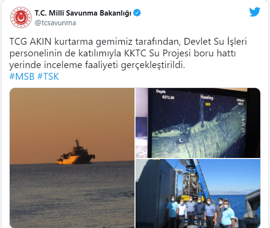 Milli Savunma Bakanlığı (MSB), "TCG AKIN kurtarma gemimiz tarafından, Devlet Su İşleri personelinin de katılımıyla KKTC Su Projesi boru hattı yerinde inceleme faaliyeti gerçekleştirildi." açıklamasında bulundu.