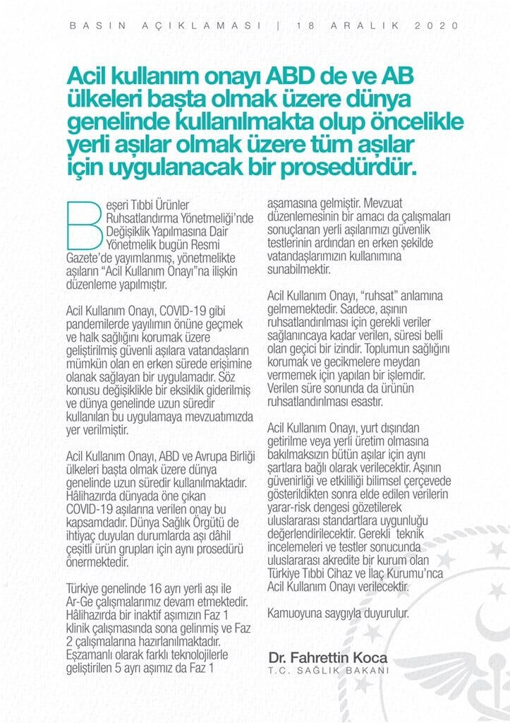 Yeni tip koronavirüse karşı geliştirilen Covid-19 aşısına verilen acil kullanım onayının bazı kimselerce yanlış anlaşılması, bu sebeple kamuoyunda yanlış bir algı oluşmaya başlamasından sonra bu konuya el atan Sağlık Bakanı Fahrettin Koca, yanlış anlaşılmaları gidermek adına sosyal medya hesabından yazılı bir duyuru yayımladı.
