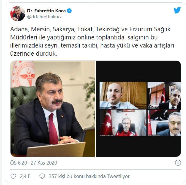 Tekirdağ, Tokat, Mersin, Sakarya, Adana ve Erzurum'un Sağlık Müdürleri ile online bir toplantı gerçekleştirdiklerini belirten Bakan Koca, bu illerdeki salgın seyrinin üzerinde durduklarını açıkladı. Temaslı takibi, vaka artışları, hastalık seyri ve hasta yükü gibi konuların işlendiği toplantıda, koronavirüs (kovid-19) vaka sayıalrının bu illerde yalnızca iki haftada yüzde 100 oranında, Erzurum ilinde ise yüzde 50 oranında artış gösterdiği belirlendi.