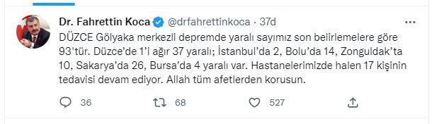 Yaralılarla ilgili son durumu aktaran Bakan Koca, "DÜZCE Gölyaka merkezli depremde yaralı sayımız son belirlemelere göre 93'tür. Düzce’de 1’i ağır 37 yaralı; İstanbul’da 2, Bolu’da 14, Zonguldak’ta 10, Sakarya’da 26, Bursa’da 4 yaralı var. Hastanelerimizde halen 17 kişinin tedavisi devam ediyor. Allah tüm afetlerden korusun." dedi.