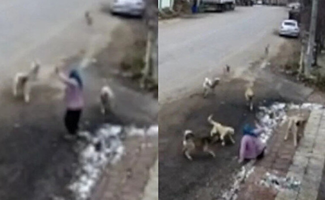 Konya'nın Doğanhisar ilçesinde bir kadının sahipsiz köpeklerin saldırısına uğradığı anlar güvenlik kamerasına yansıdı.