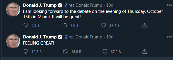 Donald Trump, resmi Twitter hesabından birer dakika arayla iki paylaşımda bulundu. İlk paylaşımında, "Harika hissediyorum!" yazan Trump, ikinci paylaşımında, "15 Ekim'de Miami'de gerçekleştirilecek olan tartışmayı dört gözle bekliyorum. Harika olacak!" dedi.