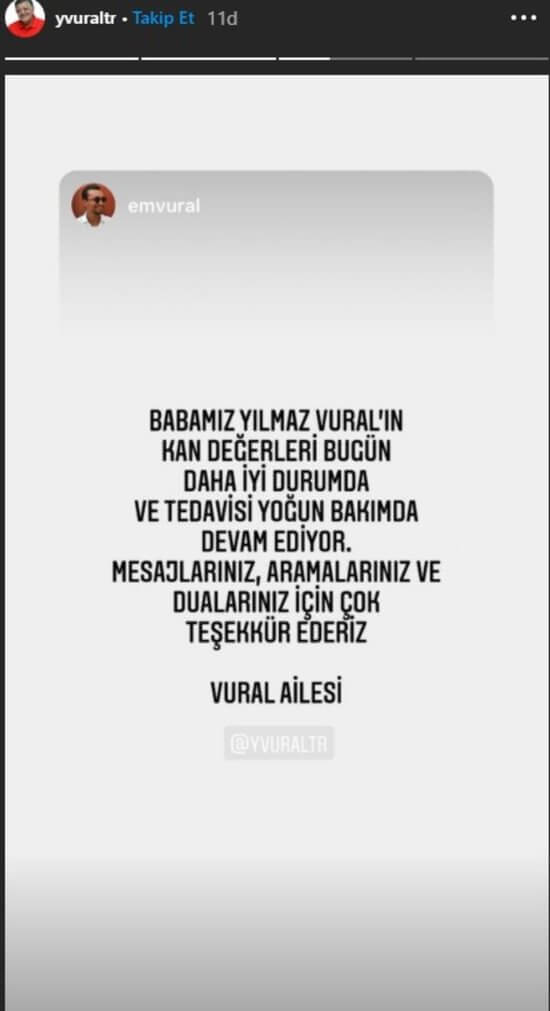 Vural ailesi, sosyal paylaşım uygulaması Instagram üzerinden bir açıklama yapmak üzere Yılmaz Vural'a ait olan, "yvuraltr" kullanıcı adlı hesabı kullandı. Yapılan açıklamaya göre, geçtiğimiz gün kovid-19 testi pozitif çıkan, ardından yoğun bakım servisine alındığı öğrenilen Yılmaz Vural'ın kan değerleri bugün çok daha iyi bir durumda.