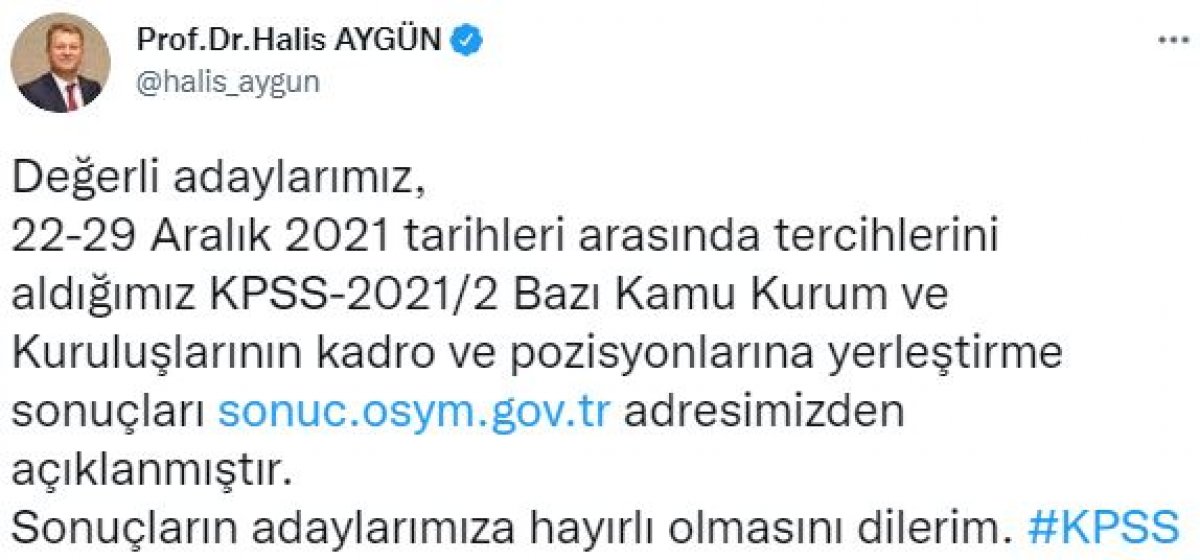 ÖSYM Başkanı Halis Aygün, sosyal medya paylaşımında, sonuçların adaylara hayırlı olmasını diledi.