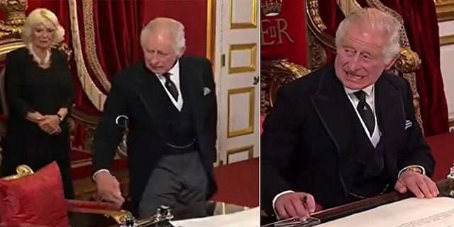 St. James Sarayı'nda düzenlenen törenle krallığını ilan eden Charles'in ilan belgelerini imzalaması sırasında sert tavırları ve yanındaki görevliye yaptığı el hareketi ülkede gündem oldu.