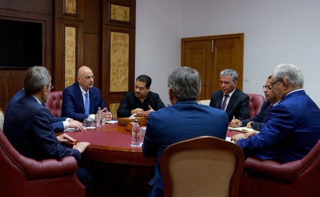 Görüşmeden fotoğraf paylaşan Bakan Dendias, Libya'da barış ve istikrarın sağlanması konusunda fikir alışverişinde bulunduklarını belirtti.