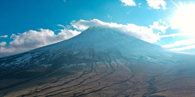 Sonbaharın tonları ve beyaz örtüsüyle renklenen Küçük Ağrı Dağı, dronla görüntülendi.