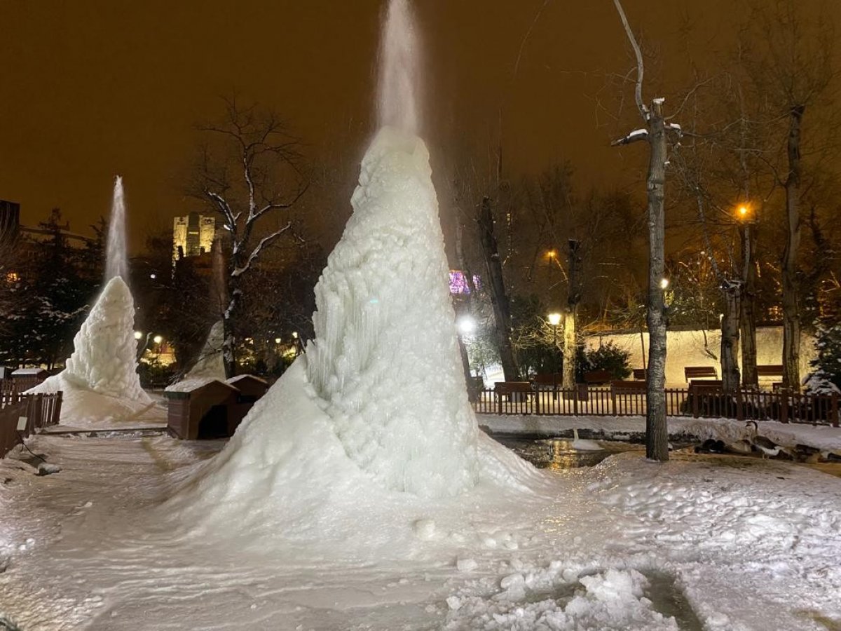 Başkent’in simge ve uğrak yeri olan Kuğulu Park’ta bulunan fıskiyelerden çıkan suyun ve havuzun buz tutması sonucunda yaklaşık 4 metre uzunluğunda 3 tane ayrı ayrı buz kütlesi oluştu.
