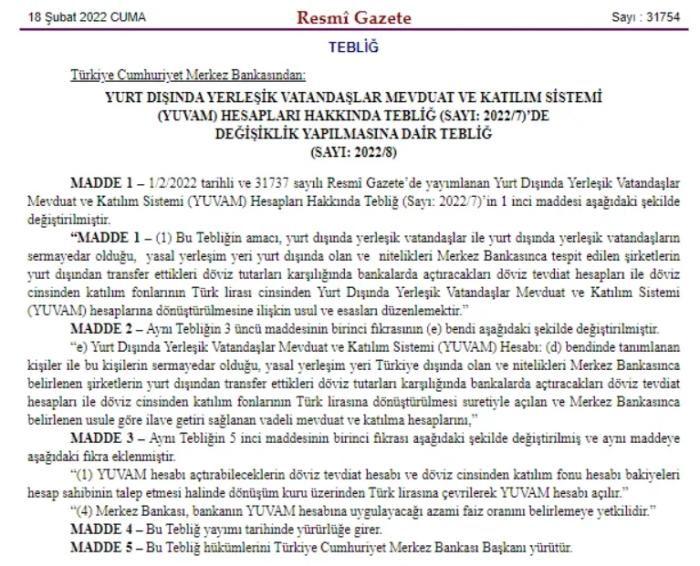 Değişiklikle; yurt dışında yaşayan Türk vatandaşlarının talep etmesi halinde, sermayedar olduğu şirketler üzerinden, ABD doları, Euro ve İngiliz sterlini cinsinden döviz tevdiat hesabı ve döviz cinsinden katılım fonu hesabı bakiyeleri dönüşüm kuru üzerinden TL'ye çevrilerek YUVAM hesabı açabileceği aktarıldı.