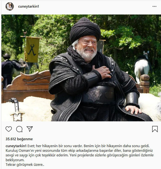 Kuruluş Osman’da 2 sezondur Aksakallıların reisi rolünü canlandıran 84 yaşındaki oyuncu, sosyal medya hesabından yaptığı paylaşımda şu ifadelere yer verdi: