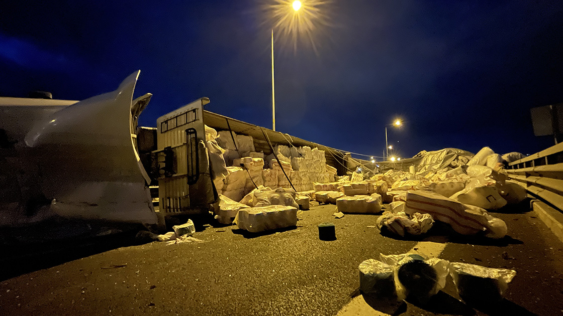 M.C. idaresindeki 27 HG 628 plakalı tır, otoyolun İzmit Doğu gişeleri bağlantı yolunda devrildi.